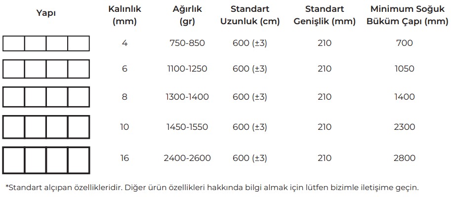 Renkler: Şeffaf, Opak, Bronz, Beyaz, Füme, Antrasit, Kırmızı, Mavi ve Yeşil renkler mevcuttur.